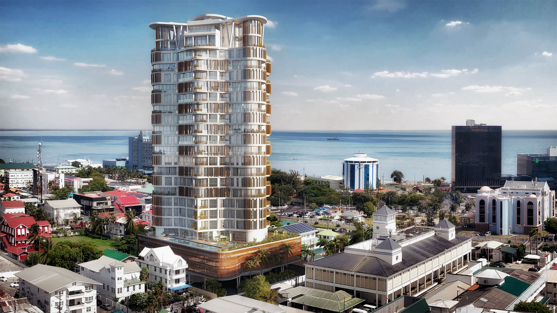 An elevated outdoor retreat featuring a private pool and sunbathing area, designed for relaxation above the city.