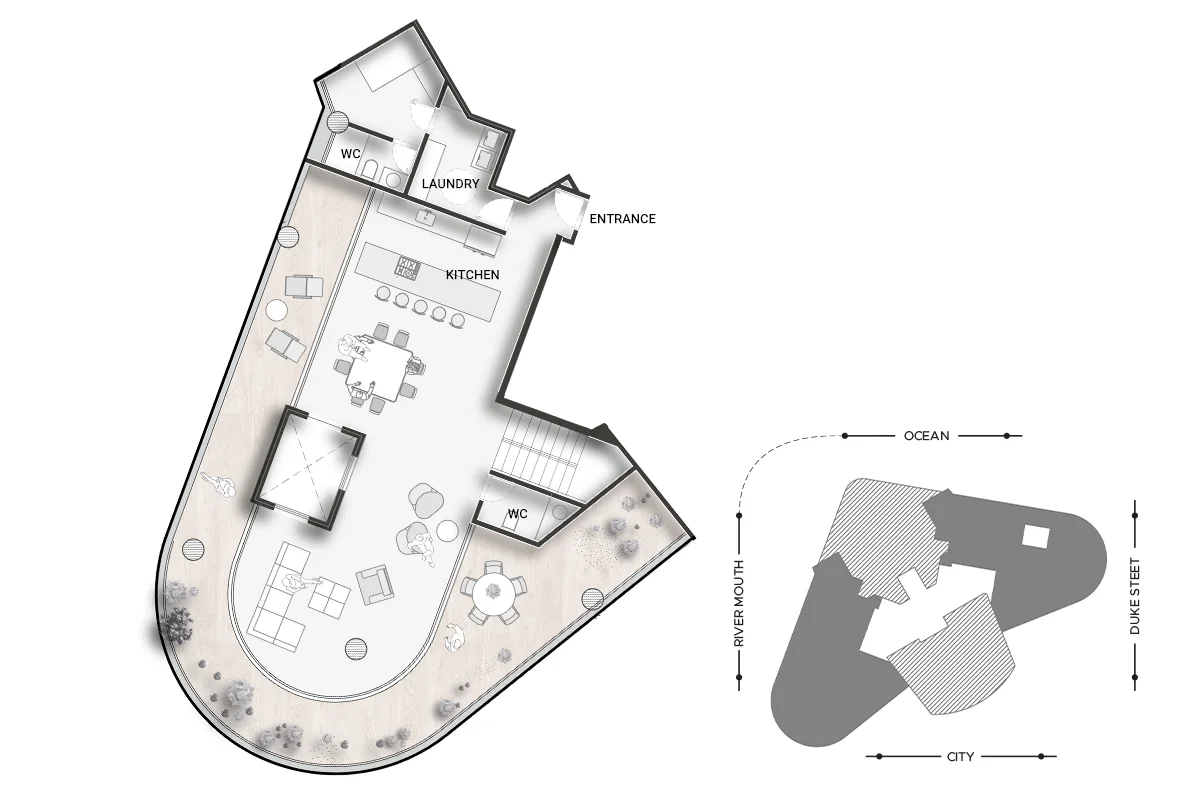 A three-level penthouse designed for those who seek absolute exclusivity. Expansive interiors, private outdoor areas, and panoramic views define this residence at the very top of Duke Tower.